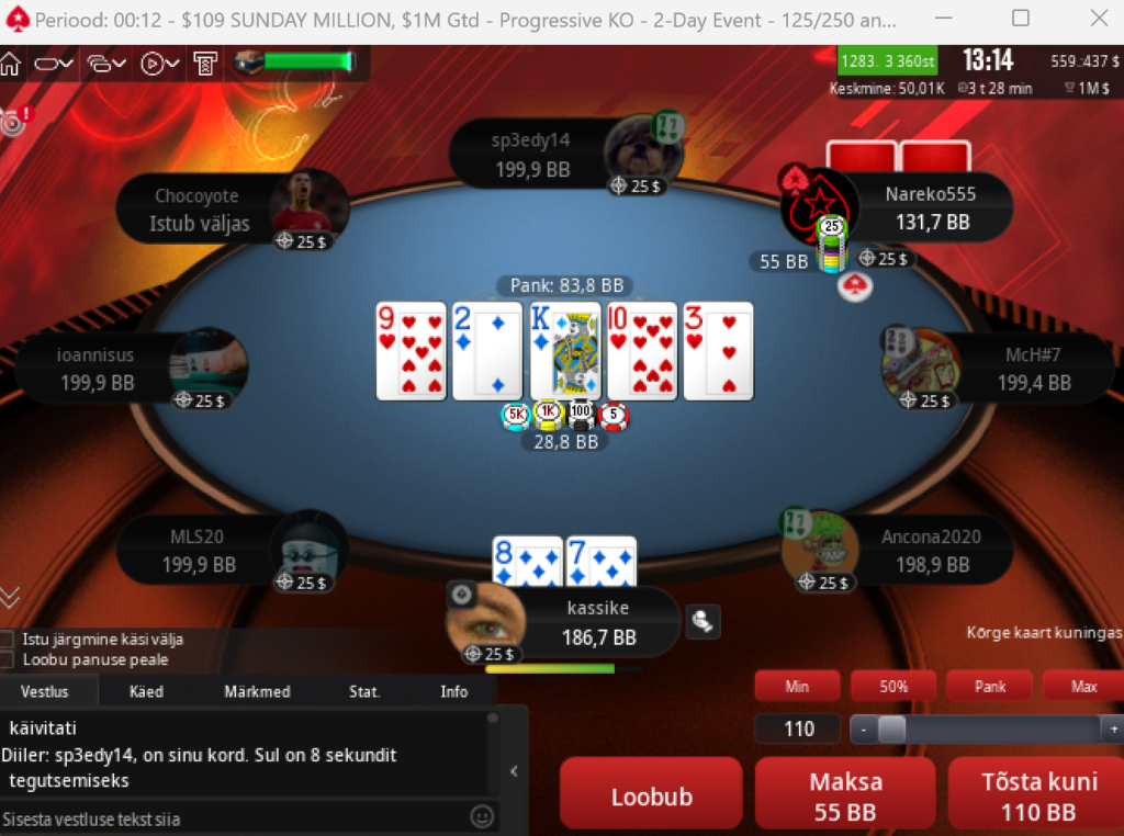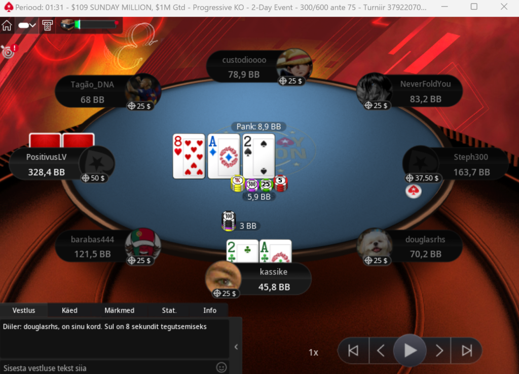 Täna oli kõikse tavalisem 109$ Sunday Million Progressive Knockout turniir, pileti olin hankinud alustades mängu 1,5$ satikalt.