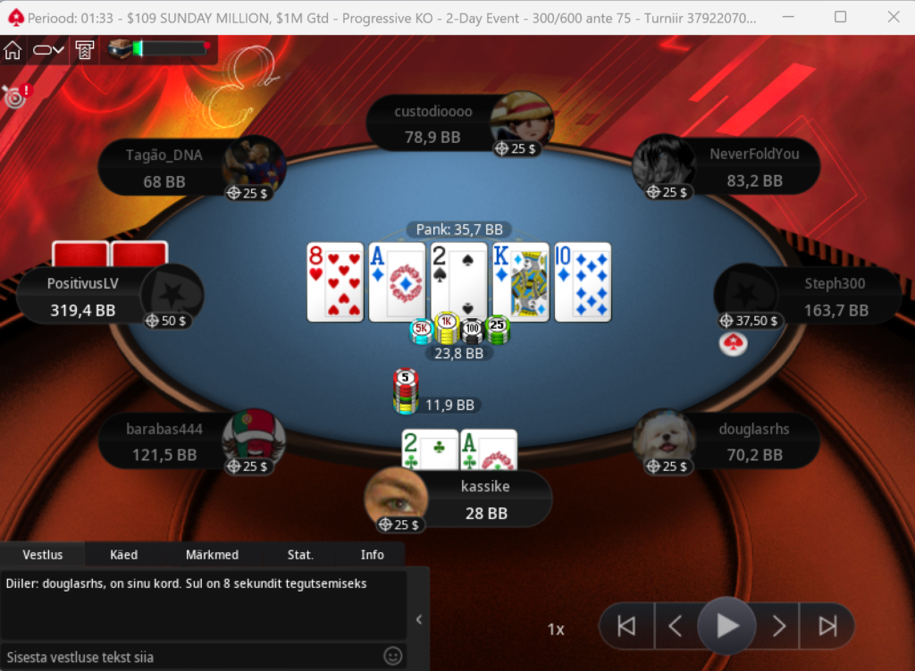 Sellegipoolest hoidsid tiimikaaslased mulle distantsilt pöialt ka viimasel turniiril, milleks oli €250 NLH Progressive Bounty (8-handed). See viimane turniir läks mul aga tõesti sujuvalt. Jälle oli lauas väga mõnus õhkkond ka. Võtsin paar mängijat välja juba üsna alguses ja seejuures täiesti ausalt, sest mu paremad algkäed AT v A4 ja KK v KQ lihtsalt pidasid vastu. Hiljem finaallauas juhtus ka seda, et kaks korda poolitasin õnnelikult potid olukorras, kus minu käsi oli tegelikult all-in sattudes nõrgem. Korra andsin mikrostäkile duubli KQ v AJ. Mullimängus pääsesin reatõmbega potist suhteliselt odavalt minema, sest kaks mängijat jõudsid enne mind kõik nupud keskele ajada. Sama käega mull ka lõhkes ning minu rida poleks kunagi saabunud. Kolmekesi jäime, kui maksin blindil saadud kahepoolse reatõmbega nii flopi kui ka turni panuse ning hittisn riverisse rea, misjärel lätlanna top-paariga mu all-ini ära callis.
